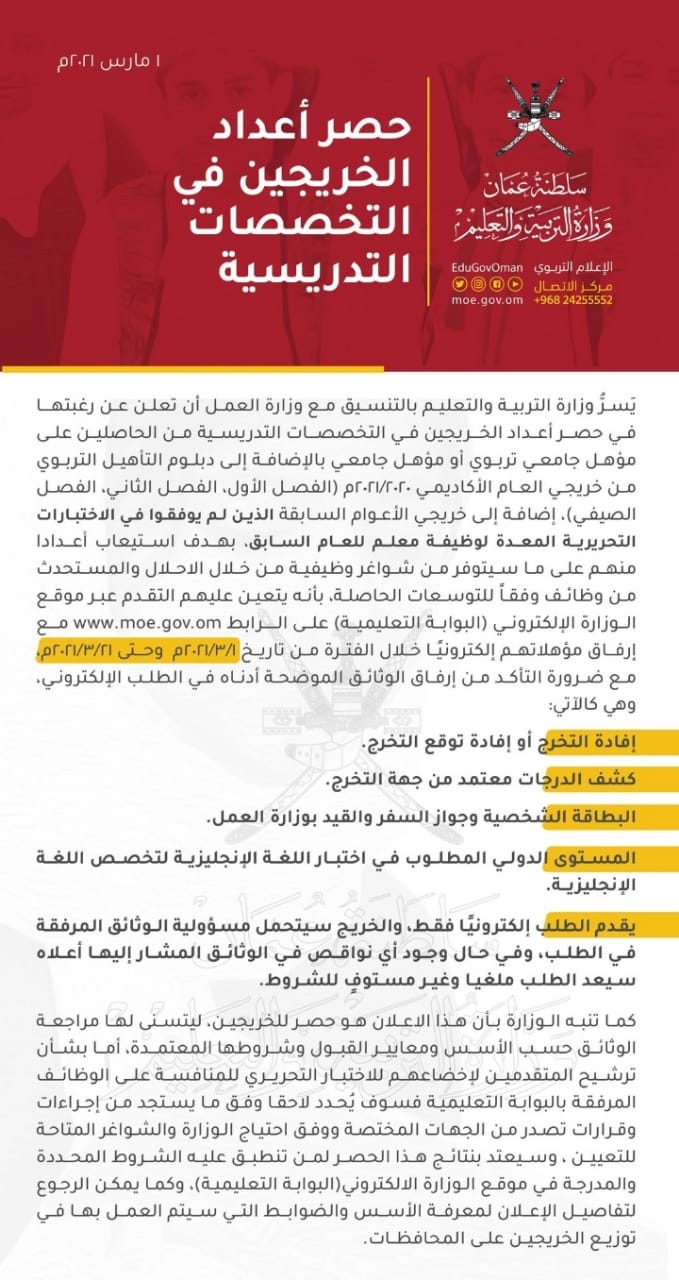 أعلنت وزارة التربية والتعليم عن رغبتها في حصر أعداد الخريجين في التخصصات التدريسية من الحاصلين على مؤهل جامعي تربوي أو مؤهل جامعي بالإضافة إلى دبلوم التأهيل التربوي من خريجي العام الأكاديمي ٢٠٢١/٢٠٢٠م (الفصل الأول، الفصل الثاني، الفصل الصيفي).