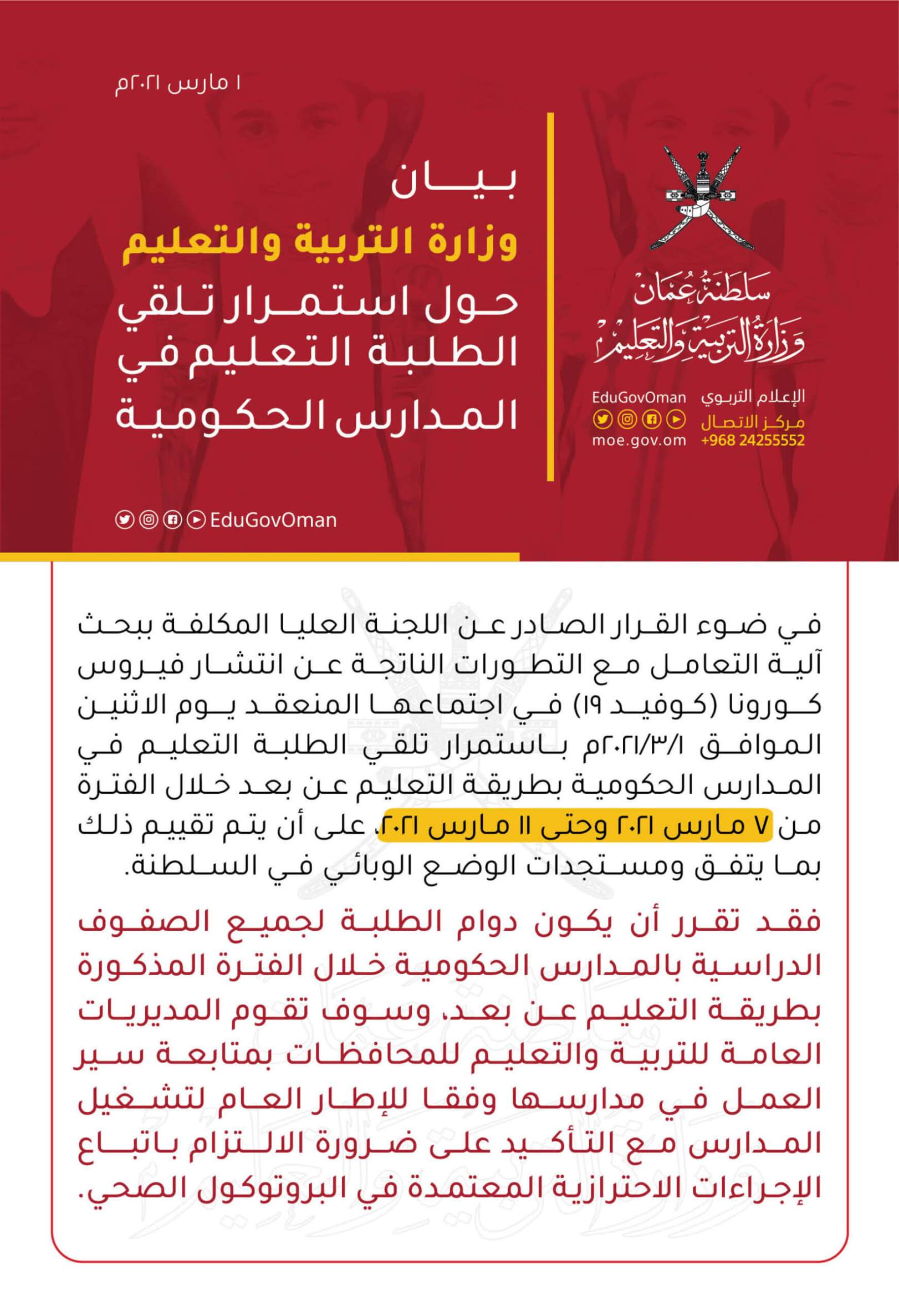 أصدرت وزارة التربية والتعليم بيان حول استمرار تلقي الطلبة التعليم في المدارس الحكومية، وتقرر أن يكون دوام الطلبة لجميع الصفوف الدراسية بالمدارس الحكومية خلال الفترة ٧-١١ مارس ٢٠٢١م بطريقة التعليم عن بعد.