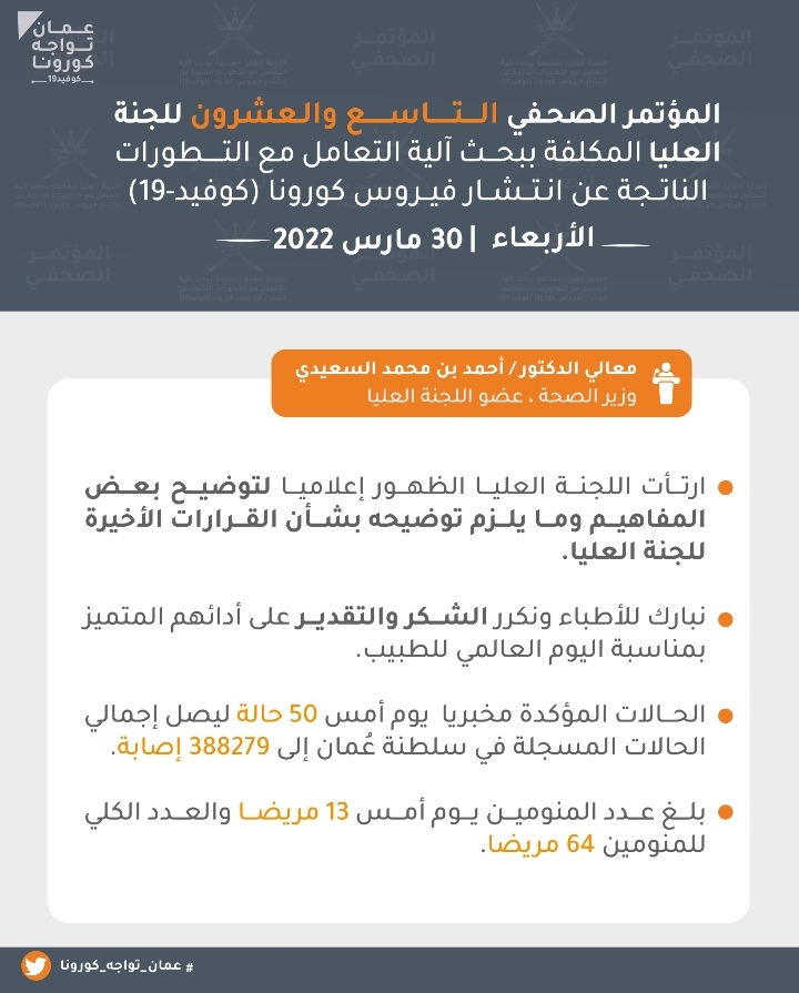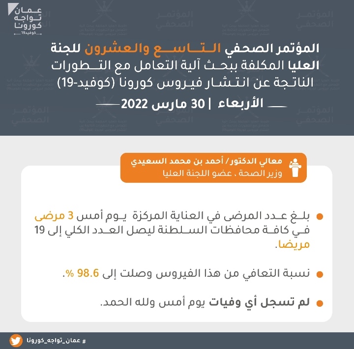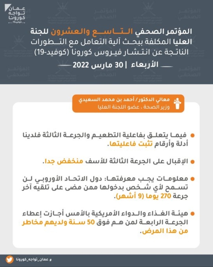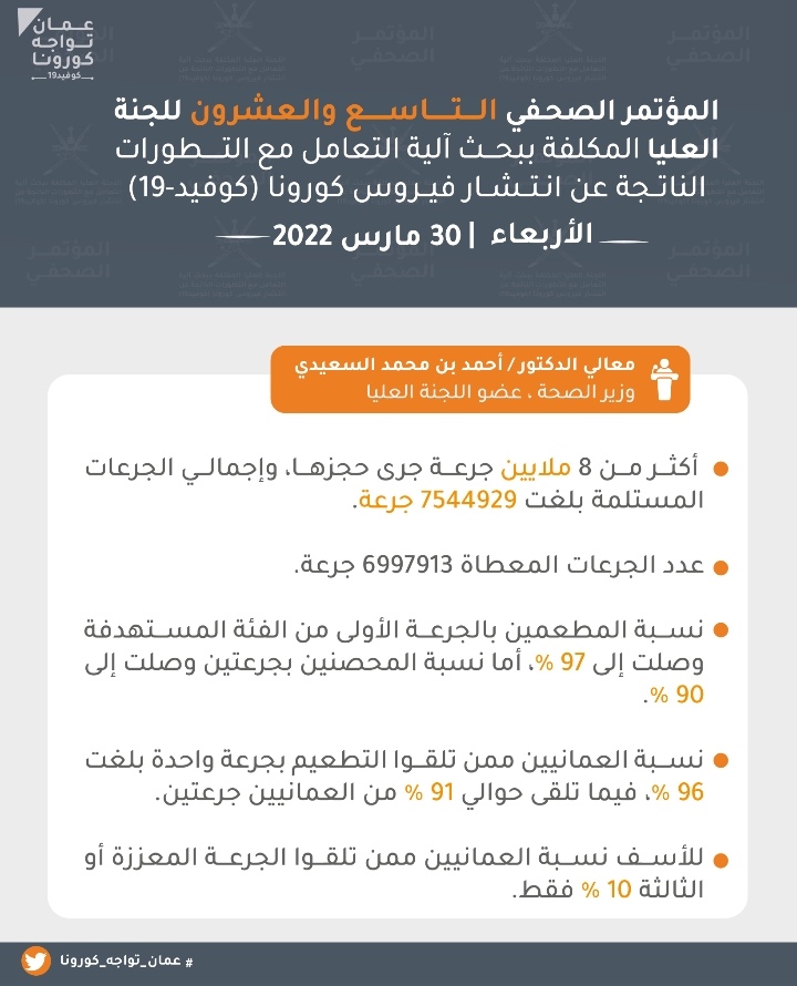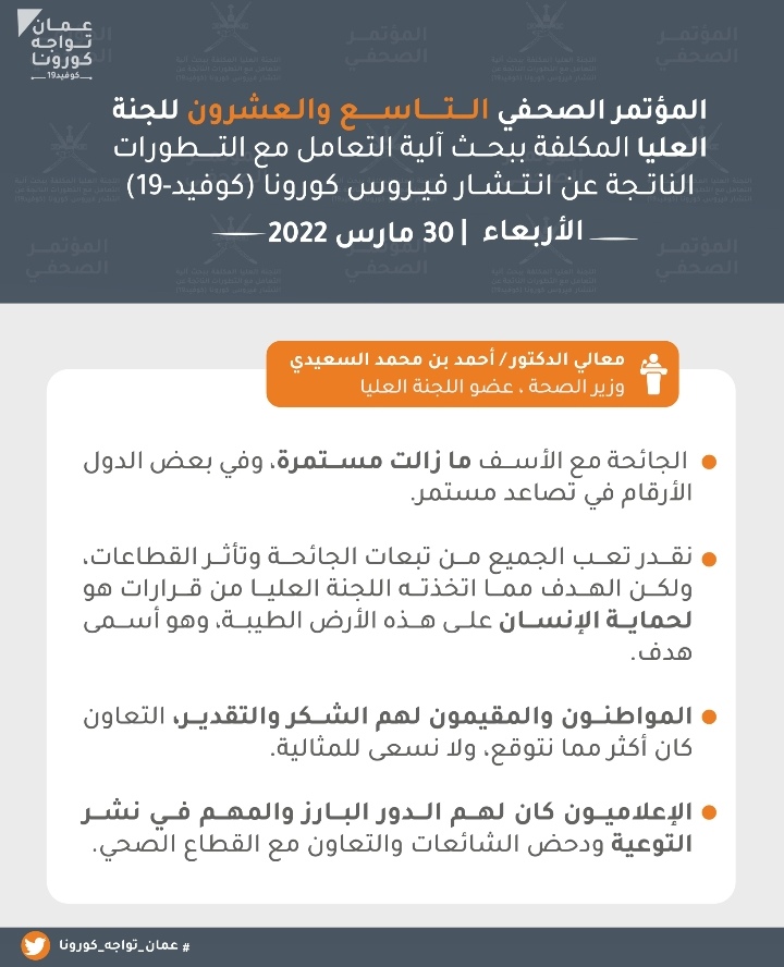 عقدت اليوم الأربعاء اللجنة العليا المكلفة ببحث آلية التعامل مع التطورات الناتجة عن انتشار فيروس كورونا كوفيد 19 المؤتمر الصحفي السادس و العشرون بمشاركة كلٍّ من : معالي الدكتور/ أحمد بن محمد السعيدي- وزير الصحة، الدكتور / عادل بن سعيد الوهيبي – مدير دائرة الترصد الوبائي بوزارة الصحة، و الأستاذ / بدر بن سيف الرواحي – مدير مكافحة الأمراض المعدية بوزارة الصحة. وجاء في المؤتمر :