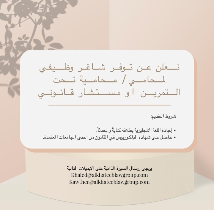 أعلنت شركة خالد الخطيب للمحاماة عن رغبتها بتعيين لديها محامي /محامية تحت التمرين أو مستشار قانوني
