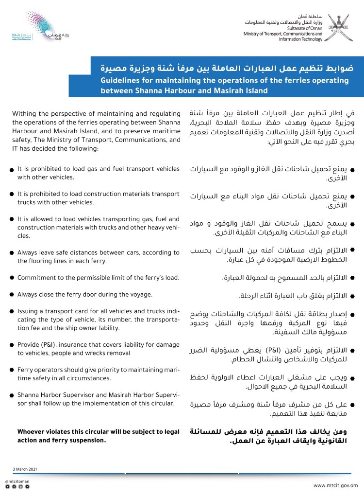 أصدرت وزارة النقل والاتصالات وتقنية المعلومات تعميمًا بحريًا بشأن تنظيم عمل العبارات العاملة بين مرفأ شنه وجزيرة مصيرة.
