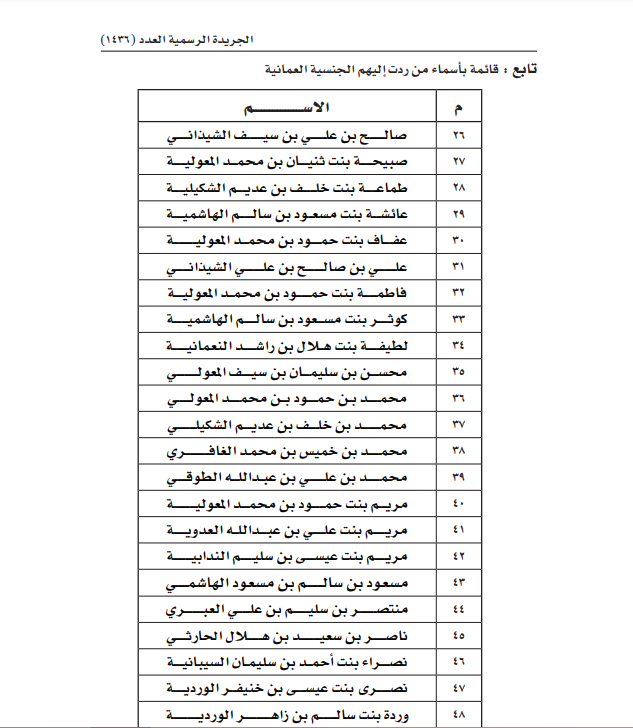 أصدر حضرة صاحب الجلالة السلطان هيثم بن طارق المعظم -حفظه الله ورعاه- مرسوما سلطانيا يقضي برد الجنسية العمانية إلى 48 شخصا، كما هو مبين في الجدول التالي: