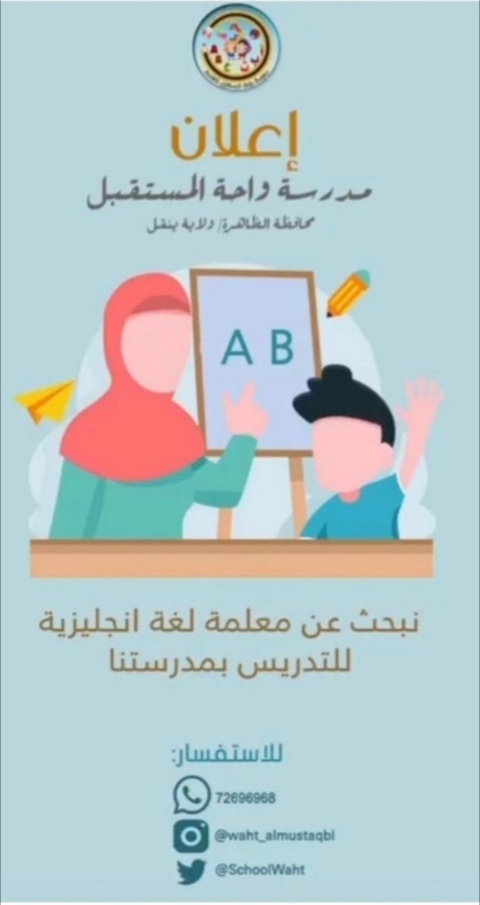 أعلنت مدرسة واحة المستقبل الخاصة عن رغبتها بتعيين لديها لمعلمة لغة إنجليزية .