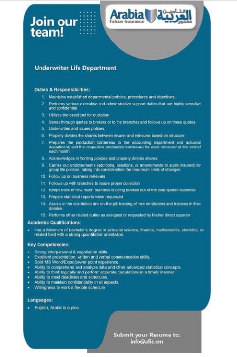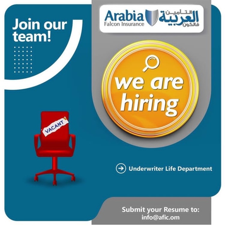 وظيفة مكتتب شاغرة في شركة التأمين العربية فالكون تتطلب شهادة البكالوريوس في المالية أو الرياضيات أو الإحصاء أو أي تخصص ذي صلة.