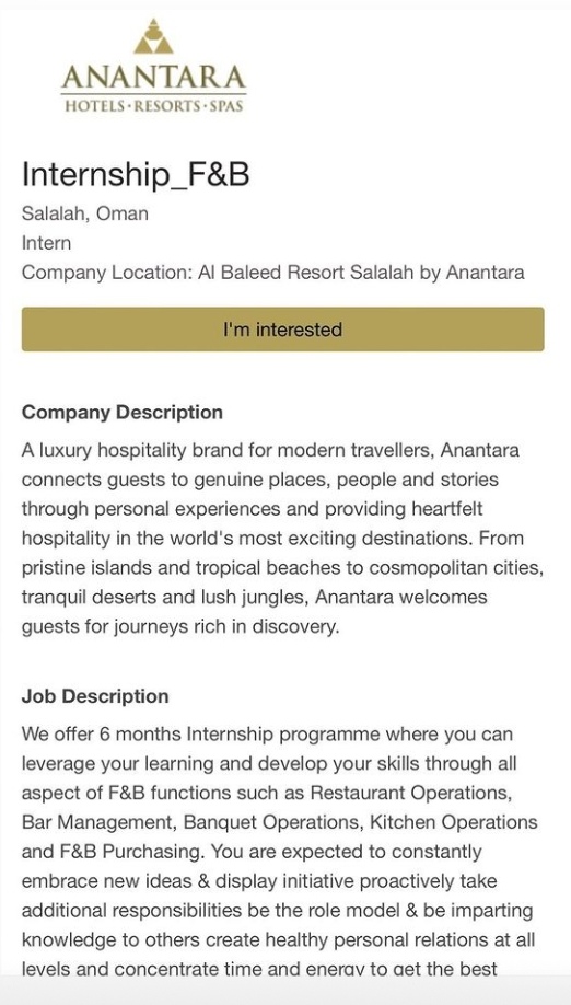 أعلن فندق أنانتارا عن تدريب داخلي _ F & B