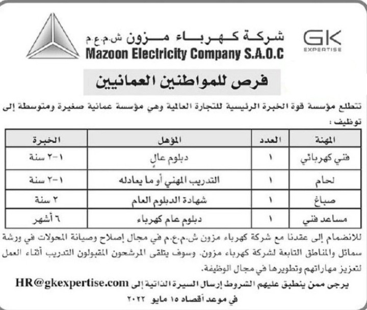 أعلنت شركة كهرباء مزون عن رغبتها بتعيين لديها :