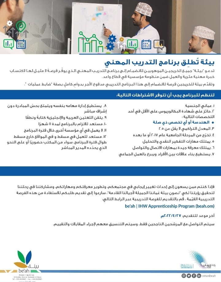 أعلنت الشركة العمانية لخدمات البيئة “بيئة” عن برنامج التدريب المهني لتخصصات بكالوريوس إدارة الأعمال ، المالية ، الإقتصاد ، الهندسة .