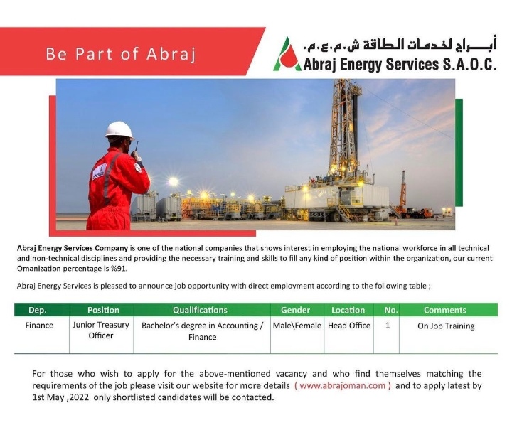 أعلنت شركة أبراج لخدمات الطاقة عن توفر شاغر وظيفي لديها لخريجي بكالوريوس المحاسبة/ المالية .