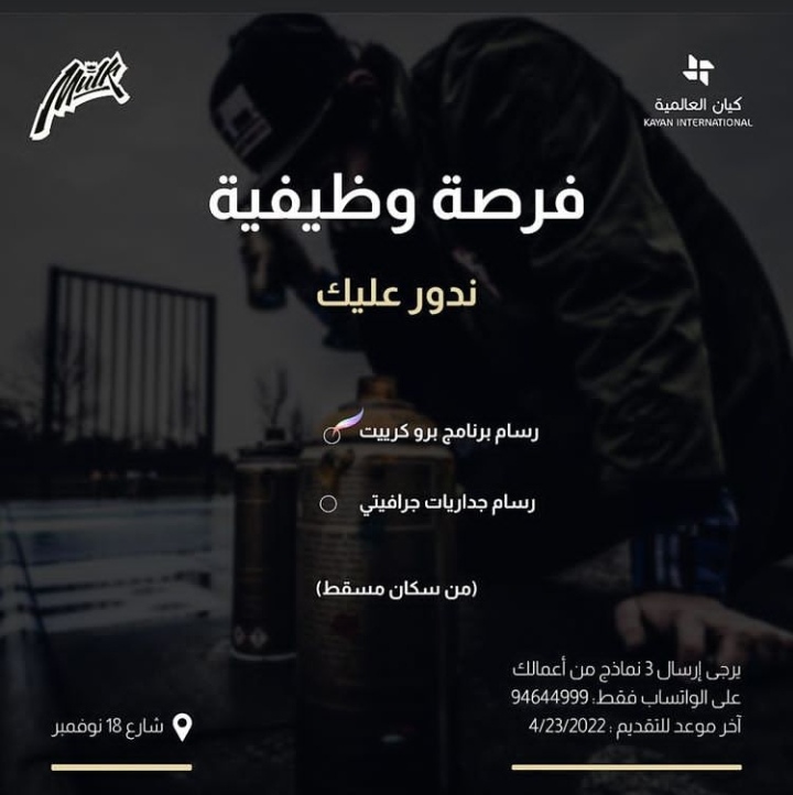 يرجى ارسال 3 نماذج من أعمال على الرقم التالي : 94644999