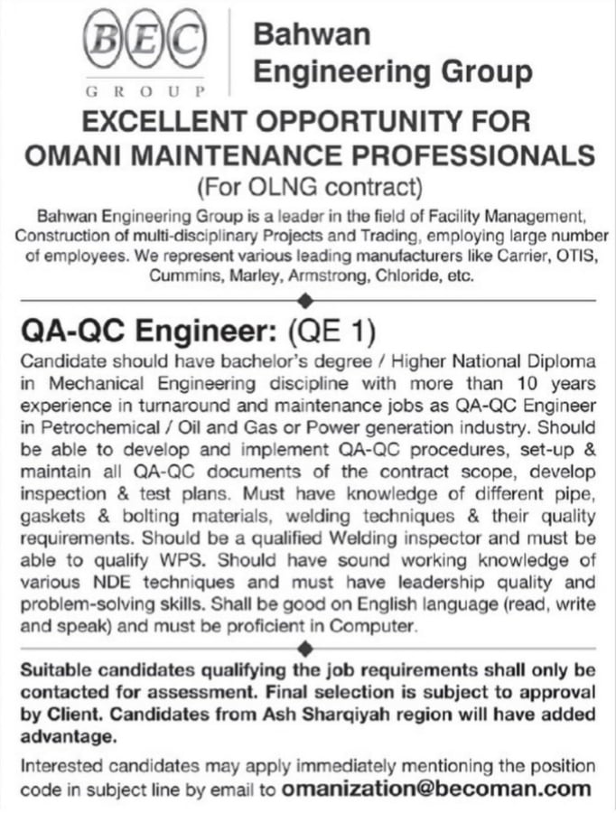 أعلنت مجموعة بهوان الهندسية عن رغبتها بتعيين لديها مهندس ضمان الجودة ومراقبة الجودة.