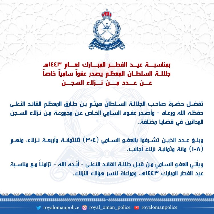 بمناسبة عيد الفطر المبارك لعام ١٤٤٣هـ جلالة السلطان المعظم يصدر عفوا ساميا خاصا عن عدد من نزلاء السجن.