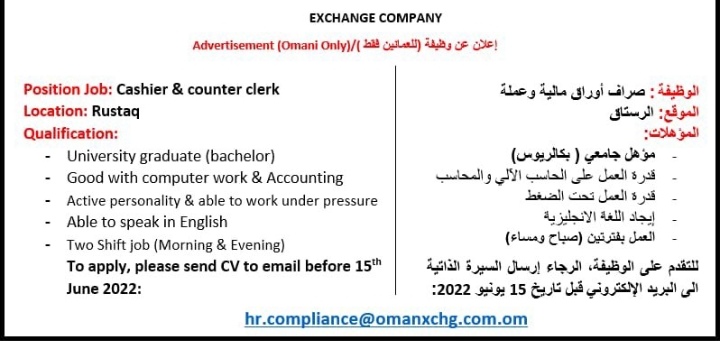 أعلنت شركة عمان للصرافة عن رغبتها بتعيين لديها صراف أوراق مالية وعملات