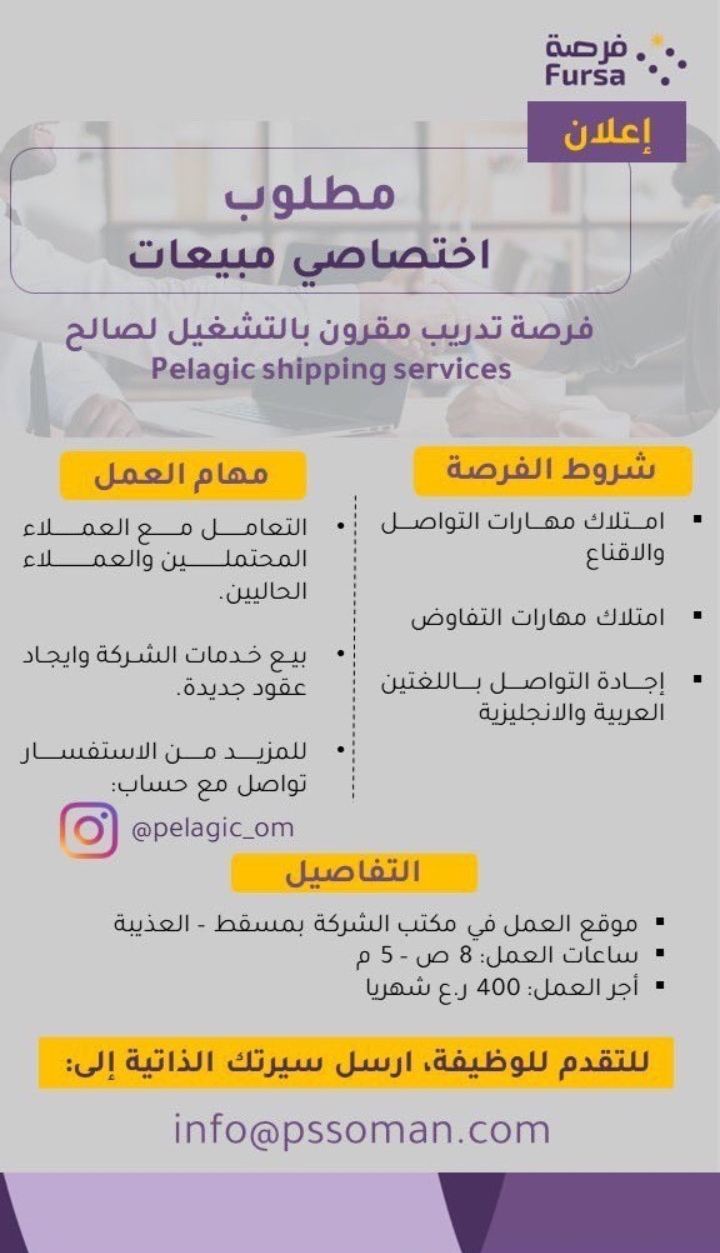 فرصة تدريب مقرون بالتشغيل اختصاصي مبيعات في شركة خدمات و مستلزمات الشحن.