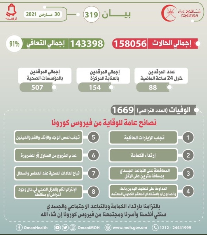 وبلغ إجمالي الحالات المُسجلة في السلطنة /158056/ حالة والمتعافين /143398/ بنسبة تصل إلى 91 بالمائة والوفيات /1669/ بنسبة 1ر1 بالمائة.