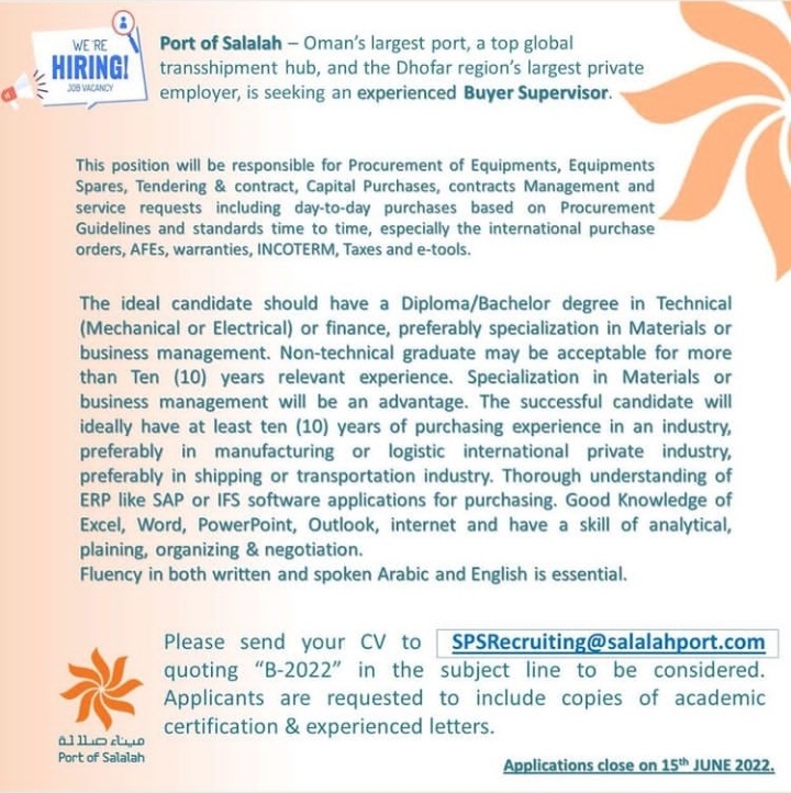 أعلن ميناء صلالة عن رغبته بتعيين لديه مشرف مشتريات.