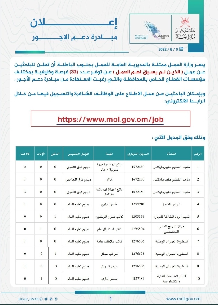 ‏بهدف الشراكة مع مؤسسات القطاع الخاص أعلنت ‎وزارة العمل عن توفر عدد (33) فرصة وظيفية بمحافظة جنوب الباطنة (للباحثين الذين لم يسبق لهم العمل) ضمن مبادرة دعم الأجور .