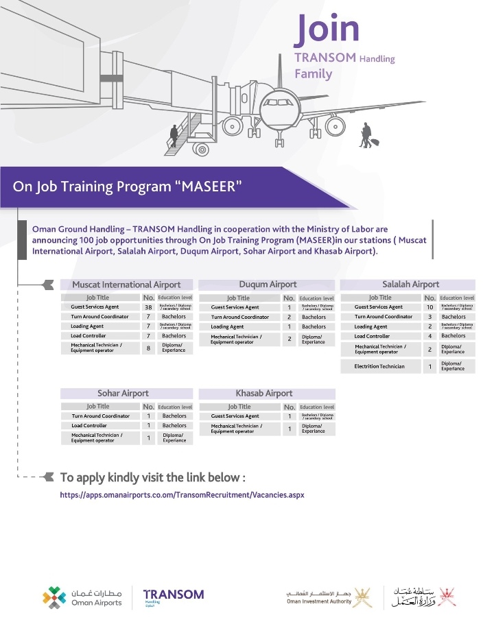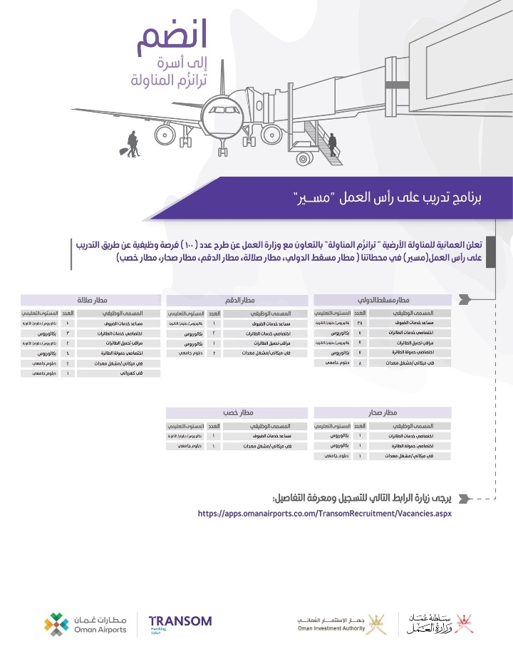 أعلنت الشركة العمانية للمناولة الأرضية – ترانزم للمناولة وبالتنسيق مع وزراة العمل تعلن عن توفر فرص تدريب على رأس العمل مقرونة بالتوظيف لعدد ١٠٠ فرصة وظيفية في مطارات مسقط ، الدقم ، صلالة ، خصب صحار)