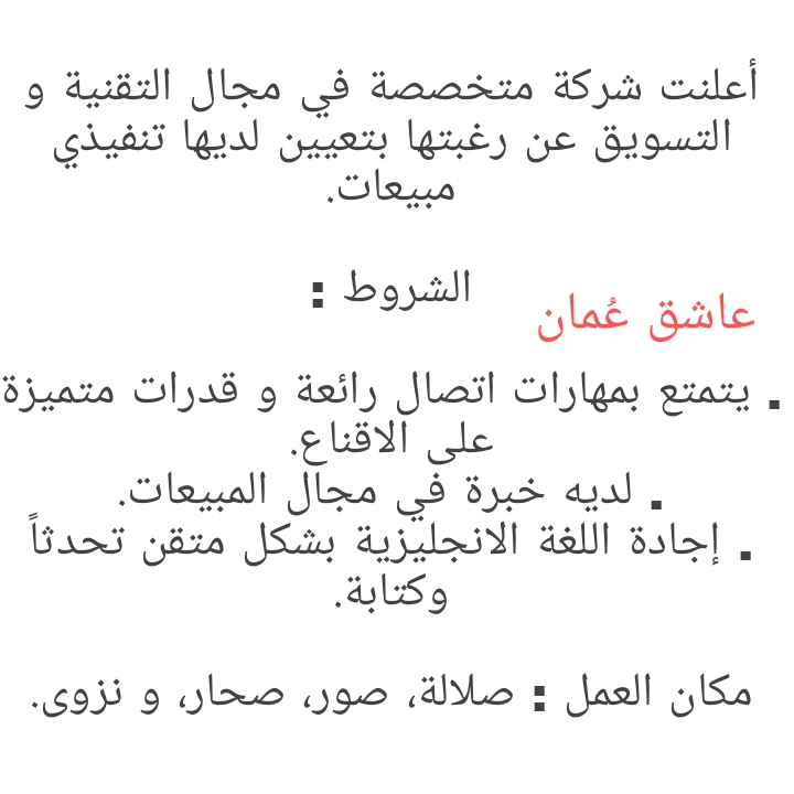 للتواصل وارسال السيرة الذاتية : R_rashid_101@hotmail.com لتصفح المزيد من جديد الوظائف و التدريب بالسلطنة اضغط هنا