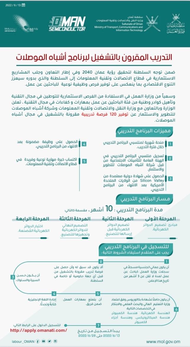 أعلنت وزارة النقل والإتصالات وتقنية المعلومات عن توفر 120 فرصة تدريبية مقرونة بالتشغيل في شركة أشباه الموصلات للتطوير و الاستثمار وذلك لخريجي بكالوريوس الهندسة الكهربائية، هندسة الميكاترونيكس،هندسة الكمبيوتر،هندسة أجراء الكمبيوتر.