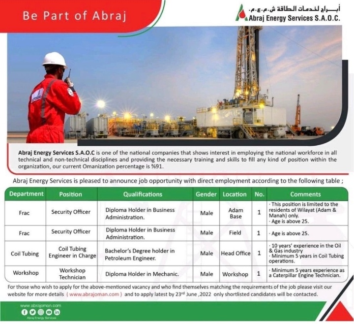 أعلنت شركة أبراج لخدمات الطاقة عن رغبتها بتعيين لديها :