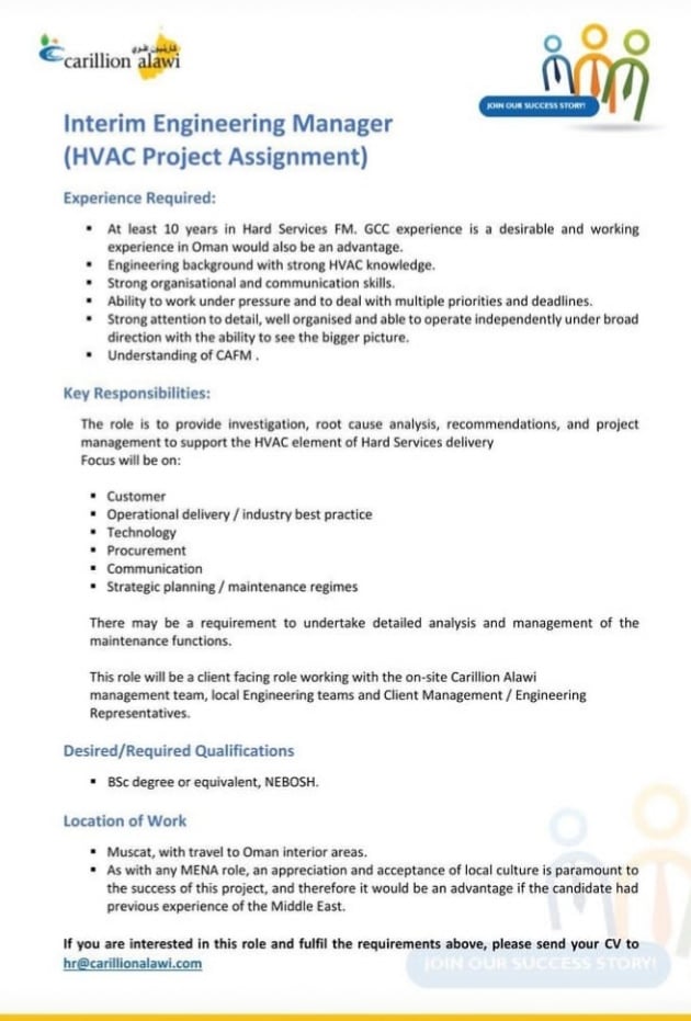 أعلنت شركة كاريليون علوي عن رغبتها بتعيين لديها مدير هندسة مؤقت
