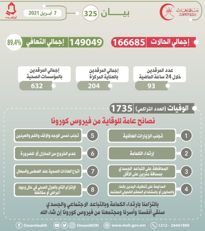 و تسجيل 7 وفيات جديدة بفيروس كورونا (كوفيد 19 ) ليصبح المجموع التراكمي للوفيات 1735 حالة .