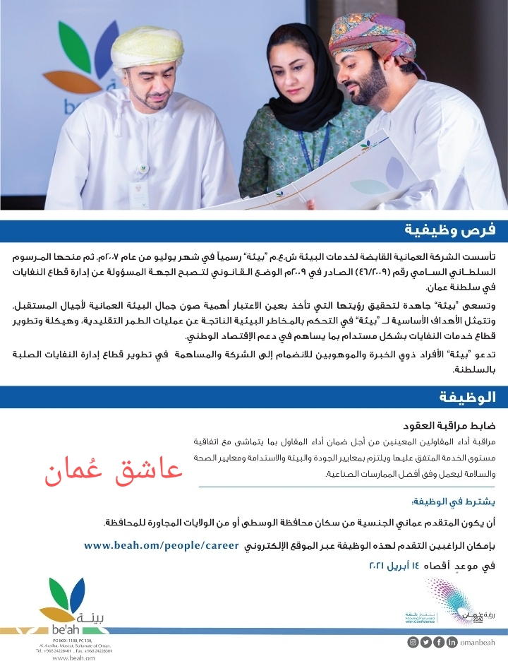 الشركة العمانية لخدمات البيئة “بيئة” – وظيفة شاغرة