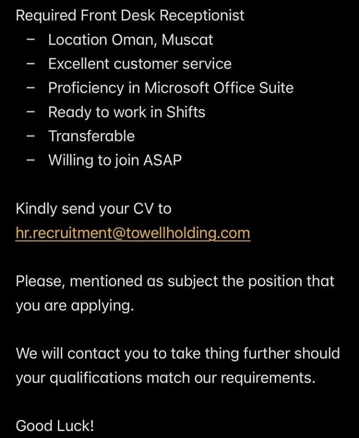 أعلنت شركة تاول العالمية القابضة في مسقط عن رغبتها بتعيين لديها موظف استقبال.