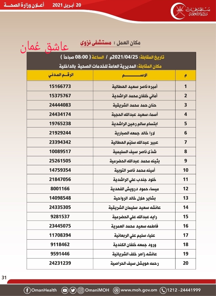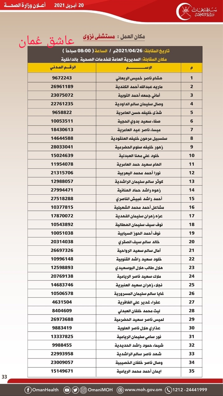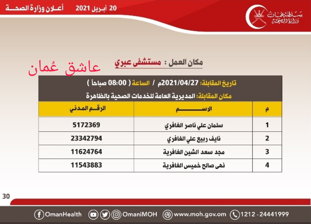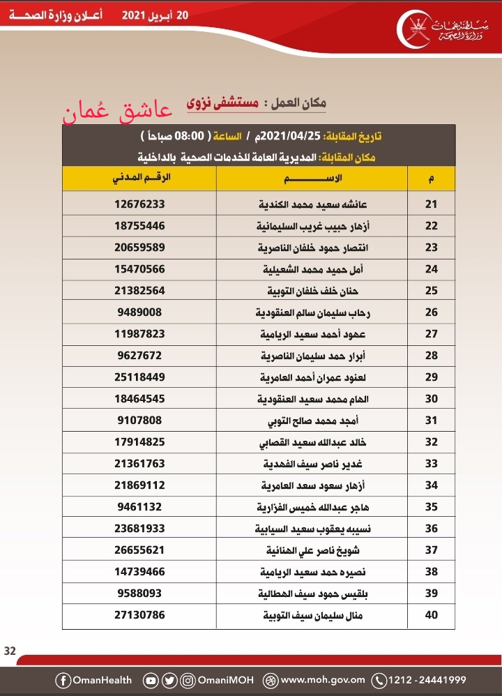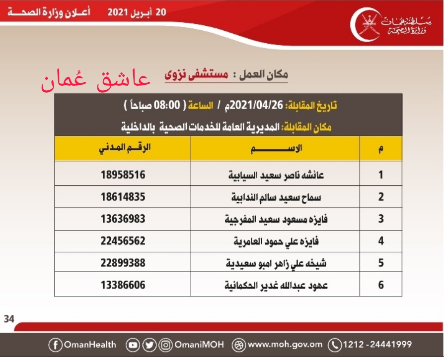 <!-- wp:gallery {"ids":[364977],"linkTo":"file"} --> <figure class="wp-block-gallery columns-1 is-cropped"><ul class="blocks-gallery-grid"><li class="blocks-gallery-item"><figure><a href="https://ol.om/wp-content/uploads/2021/04/IMG-20210420-WA0004.jpg"><img src="https://ol.om/wp-content/uploads/2021/04/IMG-20210420-WA0004-601x1024.jpg" alt="" data-id="364977" data-full-url="https://ol.om/wp-content/uploads/2021/04/IMG-20210420-WA0004.jpg" data-link="https://ol.om/364961/%d9%88%d8%b2%d8%a7%d8%b1%d8%a9-%d8%a7%d9%84%d8%b5%d8%ad%d8%a9-%d8%aa%d8%b9%d9%84%d9%86-%d8%a3%d8%b3%d9%85%d8%a7%d8%a1-%d8%a7%d9%84%d9%85%d8%af%d8%b9%d9%88%d9%8a%d9%86-%d9%84%d9%84%d9%85%d9%82%d8%a7/img-20210420-wa0004/" class="wp-image-364977" /></a></figure></li></ul></figure> <!-- /wp:gallery --> <!-- wp:gallery {"ids":[365008],"linkTo":"file"} --> <figure class="wp-block-gallery columns-1 is-cropped"><ul class="blocks-gallery-grid"><li class="blocks-gallery-item"><figure><a href="https://ol.om/wp-content/uploads/2021/04/IMG-20210420-WA0005.jpg"><img src="https://ol.om/wp-content/uploads/2021/04/IMG-20210420-WA0005.jpg" alt="" data-id="365008" data-full-url="https://ol.om/wp-content/uploads/2021/04/IMG-20210420-WA0005.jpg" data-link="https://ol.om/364961/%d9%88%d8%b2%d8%a7%d8%b1%d8%a9-%d8%a7%d9%84%d8%b5%d8%ad%d8%a9-%d8%aa%d8%b9%d9%84%d9%86-%d8%a3%d8%b3%d9%85%d8%a7%d8%a1-%d8%a7%d9%84%d9%85%d8%af%d8%b9%d9%88%d9%8a%d9%86-%d9%84%d9%84%d9%85%d9%82%d8%a7/img-20210420-wa0005/" class="wp-image-365008" /></a></figure></li></ul></figure> <!-- /wp:gallery --> <!-- wp:gallery {"ids":[365016],"linkTo":"file"} --> <figure class="wp-block-gallery columns-1 is-cropped"><ul class="blocks-gallery-grid"><li class="blocks-gallery-item"><figure><a href="https://ol.om/wp-content/uploads/2021/04/IMG-20210420-WA0007.jpg"><img src="https://ol.om/wp-content/uploads/2021/04/IMG-20210420-WA0007.jpg" alt="" data-id="365016" data-full-url="https://ol.om/wp-content/uploads/2021/04/IMG-20210420-WA0007.jpg" data-link="https://ol.om/364961/%d9%88%d8%b2%d8%a7%d8%b1%d8%a9-%d8%a7%d9%84%d8%b5%d8%ad%d8%a9-%d8%aa%d8%b9%d9%84%d9%86-%d8%a3%d8%b3%d9%85%d8%a7%d8%a1-%d8%a7%d9%84%d9%85%d8%af%d8%b9%d9%88%d9%8a%d9%86-%d9%84%d9%84%d9%85%d9%82%d8%a7/img-20210420-wa0007/" class="wp-image-365016" /></a></figure></li></ul></figure> <!-- /wp:gallery --> <!-- wp:gallery {"ids":[365012],"linkTo":"file"} --> <figure class="wp-block-gallery columns-1 is-cropped"><ul class="blocks-gallery-grid"><li class="blocks-gallery-item"><figure><a href="https://ol.om/wp-content/uploads/2021/04/IMG-20210420-WA0006.jpg"><img src="https://ol.om/wp-content/uploads/2021/04/IMG-20210420-WA0006.jpg" alt="" data-id="365012" data-full-url="https://ol.om/wp-content/uploads/2021/04/IMG-20210420-WA0006.jpg" data-link="https://ol.om/364961/%d9%88%d8%b2%d8%a7%d8%b1%d8%a9-%d8%a7%d9%84%d8%b5%d8%ad%d8%a9-%d8%aa%d8%b9%d9%84%d9%86-%d8%a3%d8%b3%d9%85%d8%a7%d8%a1-%d8%a7%d9%84%d9%85%d8%af%d8%b9%d9%88%d9%8a%d9%86-%d9%84%d9%84%d9%85%d9%82%d8%a7/img-20210420-wa0006/" class="wp-image-365012" /></a></figure></li></ul></figure> <!-- /wp:gallery --> <!-- wp:gallery {"ids":[364962],"linkTo":"file"} --> <figure class="wp-block-gallery columns-1 is-cropped"><ul class="blocks-gallery-grid"><li class="blocks-gallery-item"><figure><a href="https://ol.om/wp-content/uploads/2021/04/PicsArt_04-20-09.55.41.jpg"><img src="https://ol.om/wp-content/uploads/2021/04/PicsArt_04-20-09.55.41-577x1024.jpg" alt="" data-id="364962" data-full-url="https://ol.om/wp-content/uploads/2021/04/PicsArt_04-20-09.55.41.jpg" data-link="https://ol.om/?attachment_id=364962" class="wp-image-364962" /></a></figure></li></ul></figure> <!-- /wp:gallery --> <!-- wp:gallery {"ids":[364965],"linkTo":"file"} --> <figure class="wp-block-gallery columns-1 is-cropped"><ul class="blocks-gallery-grid"><li class="blocks-gallery-item"><figure><a href="https://ol.om/wp-content/uploads/2021/04/IMG-20210420-WA0001.jpg"><img src="https://ol.om/wp-content/uploads/2021/04/IMG-20210420-WA0001.jpg" alt="" data-id="364965" data-full-url="https://ol.om/wp-content/uploads/2021/04/IMG-20210420-WA0001.jpg" data-link="https://ol.om/364961/%d9%88%d8%b2%d8%a7%d8%b1%d8%a9-%d8%a7%d9%84%d8%b5%d8%ad%d8%a9-%d8%aa%d8%b9%d9%84%d9%86-%d8%a3%d8%b3%d9%85%d8%a7%d8%a1-%d8%a7%d9%84%d9%85%d8%af%d8%b9%d9%88%d9%8a%d9%86-%d9%84%d9%84%d9%85%d9%82%d8%a7/img-20210420-wa0001/" class="wp-image-364965" /></a></figure></li></ul></figure> <!-- /wp:gallery --> <!-- wp:gallery {"ids":[364968],"linkTo":"file"} --> <figure class="wp-block-gallery columns-1 is-cropped"><ul class="blocks-gallery-grid"><li class="blocks-gallery-item"><figure><a href="https://ol.om/wp-content/uploads/2021/04/IMG-20210420-WA0002.jpg"><img src="https://ol.om/wp-content/uploads/2021/04/IMG-20210420-WA0002.jpg" alt="" data-id="364968" data-full-url="https://ol.om/wp-content/uploads/2021/04/IMG-20210420-WA0002.jpg" data-link="https://ol.om/364961/%d9%88%d8%b2%d8%a7%d8%b1%d8%a9-%d8%a7%d9%84%d8%b5%d8%ad%d8%a9-%d8%aa%d8%b9%d9%84%d9%86-%d8%a3%d8%b3%d9%85%d8%a7%d8%a1-%d8%a7%d9%84%d9%85%d8%af%d8%b9%d9%88%d9%8a%d9%86-%d9%84%d9%84%d9%85%d9%82%d8%a7/img-20210420-wa0002/" class="wp-image-364968" /></a></figure></li></ul></figure> <!-- /wp:gallery --> <!-- wp:gallery {"ids":[364971],"linkTo":"file"} --> <figure class="wp-block-gallery columns-1 is-cropped"><ul class="blocks-gallery-grid"><li class="blocks-gallery-item"><figure><a href="https://ol.om/wp-content/uploads/2021/04/IMG-20210420-WA0003.jpg"><img src="https://ol.om/wp-content/uploads/2021/04/IMG-20210420-WA0003.jpg" alt="" data-id="364971" data-full-url="https://ol.om/wp-content/uploads/2021/04/IMG-20210420-WA0003.jpg" data-link="https://ol.om/364961/%d9%88%d8%b2%d8%a7%d8%b1%d8%a9-%d8%a7%d9%84%d8%b5%d8%ad%d8%a9-%d8%aa%d8%b9%d9%84%d9%86-%d8%a3%d8%b3%d9%85%d8%a7%d8%a1-%d8%a7%d9%84%d9%85%d8%af%d8%b9%d9%88%d9%8a%d9%86-%d9%84%d9%84%d9%85%d9%82%d8%a7/img-20210420-wa0003/" class="wp-image-364971" /></a></figure></li></ul></figure> <!-- /wp:gallery -->