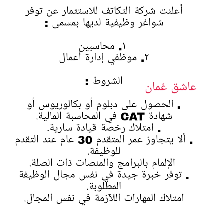 للتواصل وارسال السيرة الذاتية : careers@altkatof.com لتصفح المزيد من جديد الوظائف و التدريب بالسلطنة اضغط هنا