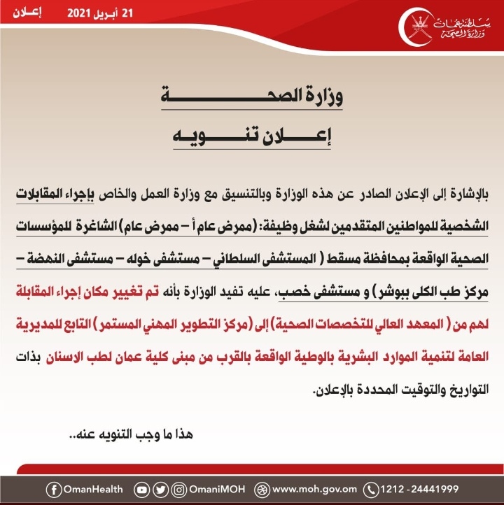 أفادت الوزارة بأنه تم تغيير مكان إجراء المقابلة بذات التواريخ والتوقيت المحددة بالإعلان.