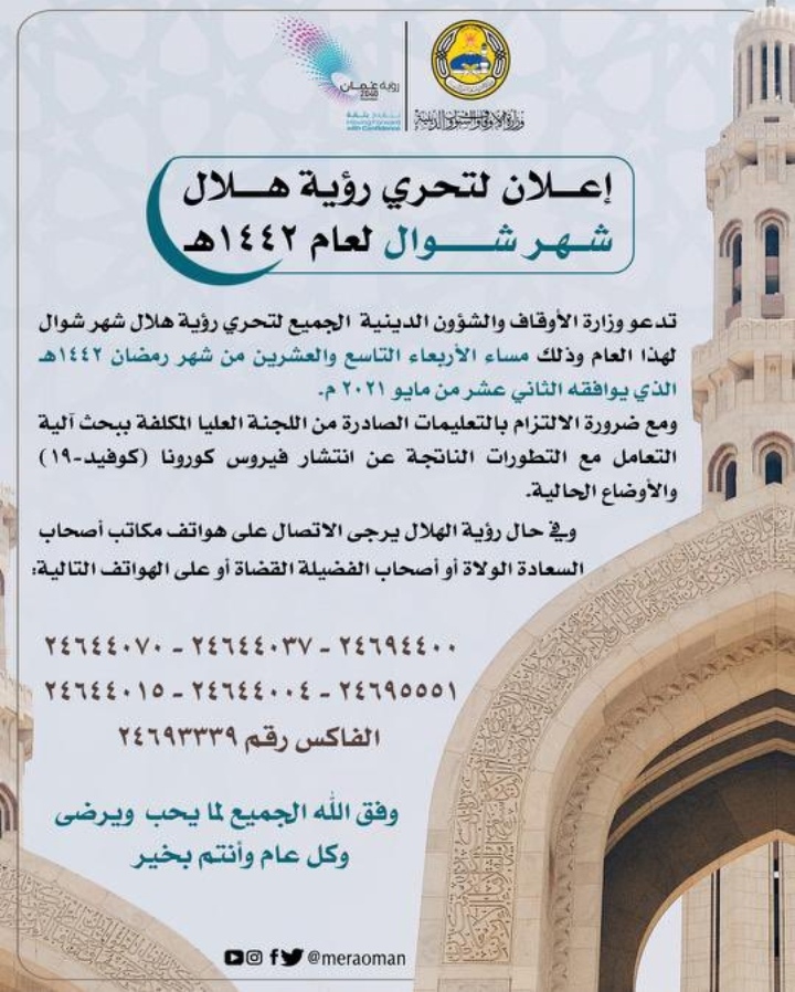 دعت وزارة الأوقاف والشؤون الدينية الجميع لتحري رؤية هلال شهر شوال لهذا العام و ذلك مساء الأربعاء التاسع و العشرين من شهر رمضان الذي يوافقه الثاني عشر من مايو 2021م.