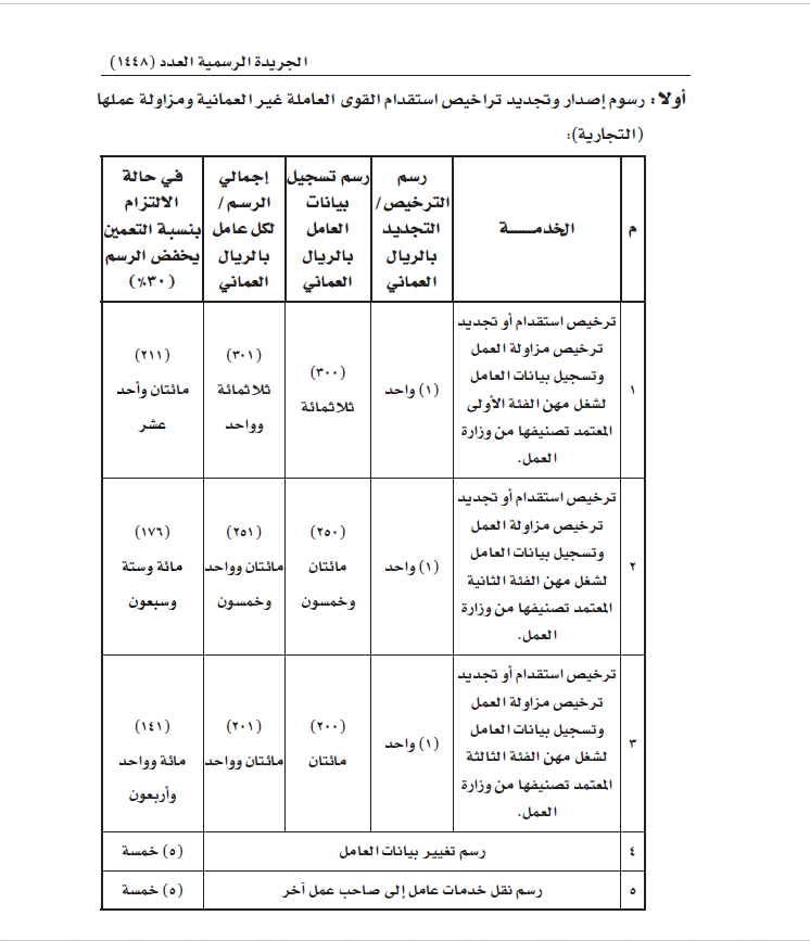 أصدرت وزارة العمل قرارا وزاريا بشأن تعديل بعض أحكام القرار الوزاري رقم 340 لسنة 2016 بشأن رسوم إصدار وتجديد تراخيص استقدام القوى العاملة غير العمانية ومزاولة عملها.