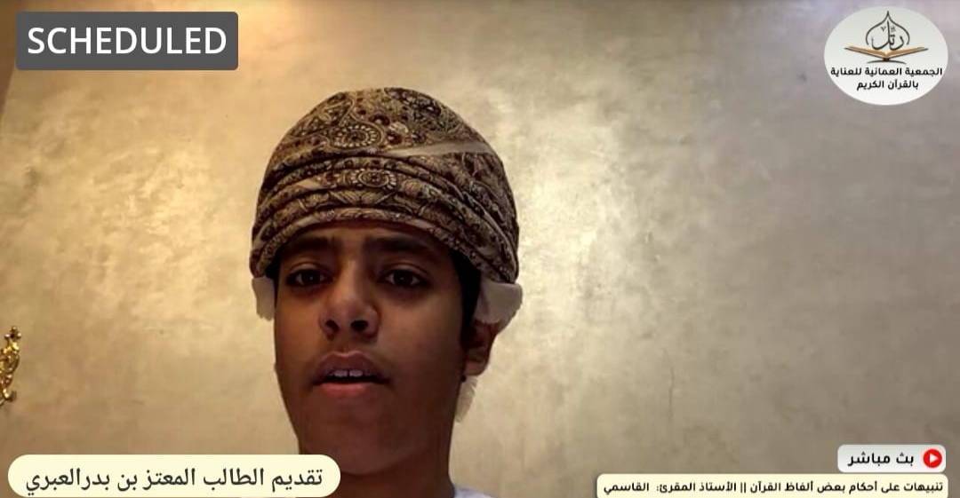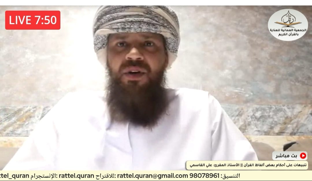 أقامت الجمعية العمانية للعناية بالقرآن الكريم مساء يوم الثلاثاء: (28 رمضان 1442هـ – 11 مايو 2021م) محاضرة عن بُعْد بعنوان: (تنبيهات على أحكام بعض ألفاظ القرآن)، للأستاذ المقرئ/ علي بن مبارك بن حمدان القاسمي (مدرب تلاوة وتجويد – ماجستير في القراءات)، وقد قدم للمحاضرة الطالب/ المعتز بن بدر بن حمد العبري، من الصف التاسع بمدرسة الخوير للتعليم الأساسي (5-9) بولاية بوشر.