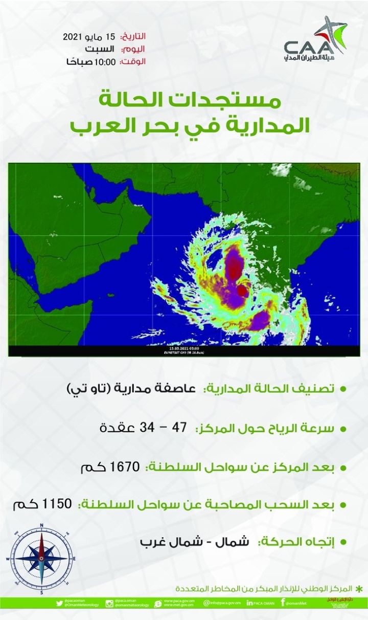 أفادت الأرصاد الجوية بأن مستجدات الحالة المدارية في بحر العرب تصنف بعاصفة مدارية مع قابلية التعمق إلى إعصار مداري خلال الـ12 ساعة القادمة.