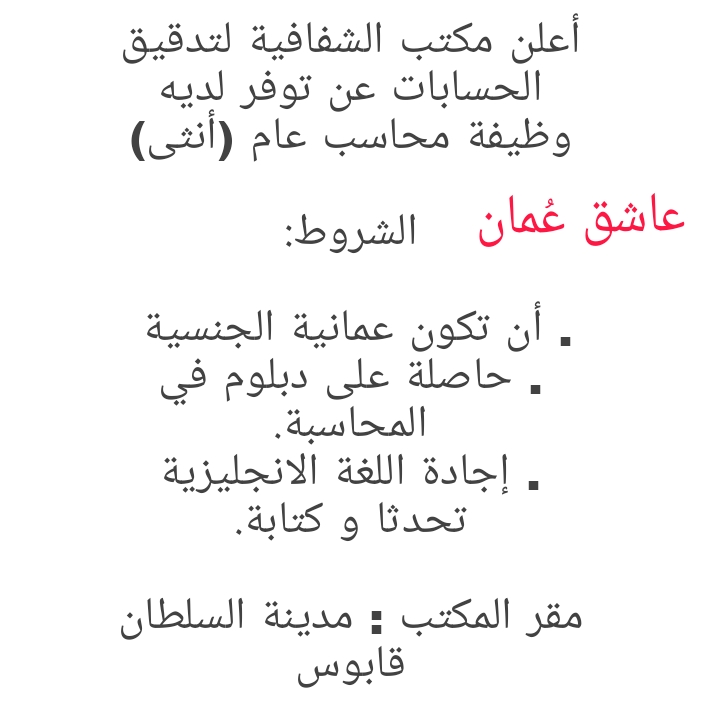 للتواصل وارسال السيرة الذاتية : Transperancyauditors@gmail.com لتصفح المزيد من جديد الوظائف و التدريب بالسلطنة اضغط هنا