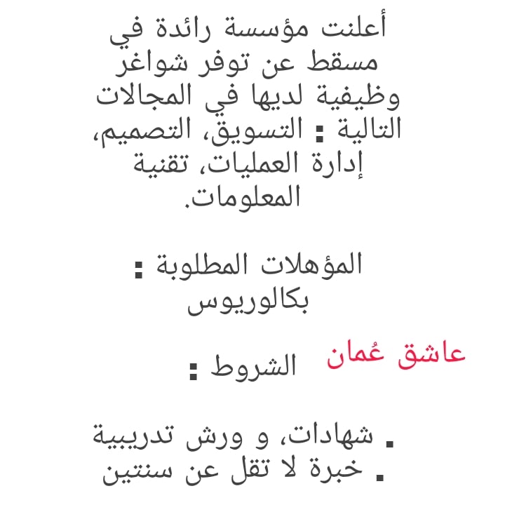 للتواصل وارسال السيرة الذاتية : mubader.hr@gmail.com لتصفح المزيد من جديد الوظائف و التدريب بالسلطنة اضغط هنا