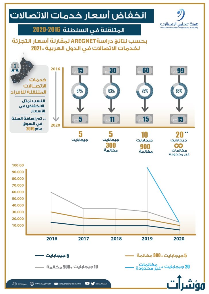 حققت السلطنة المركز الأول خليجياً كأقل أسعار في بعض سلل خدمات الاتصالات المُتنقلة؛ وذلك بحسب نتائج دراسة مُستقلة لمقارنة أسعار التجزئة لخدمات الاتصالات في الدول العربية لعام 2021، والتي أجرتها الشبكة العربية لهيئات تنظيم الاتصالات و تقنية المعلومات .