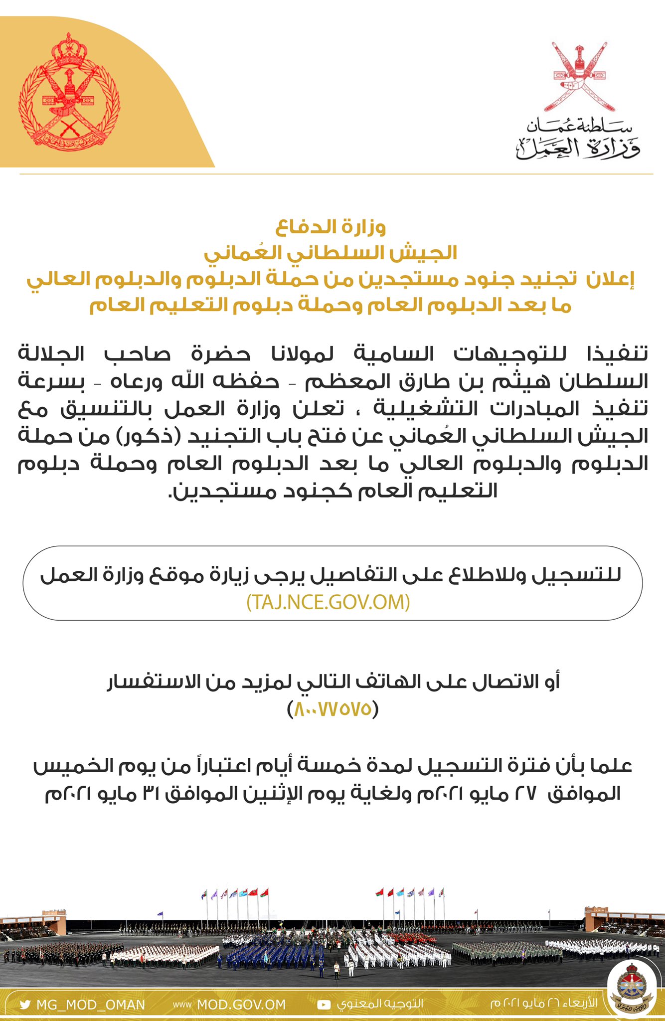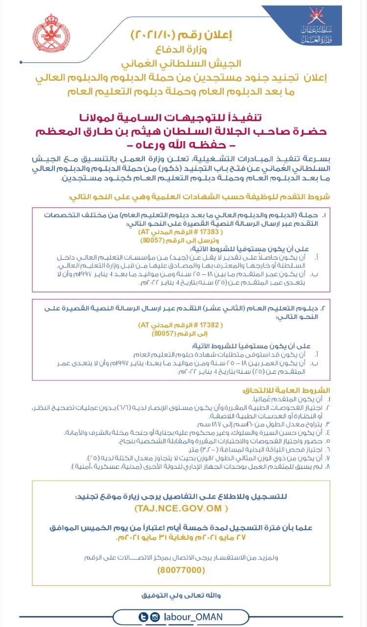 أعلنت وزارة العمل بالتنسيق مع الجيش السلطاني العماني عن فتح باب التجنيد (ذكور) من حملة الدبلوم والدبلوم العالي ما بعد الدبلوم العام وحملة دبلوم التعليم العام كجنود مستجدين.
