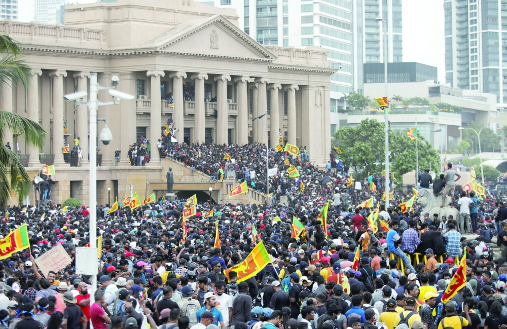 ولم يتمكن أفراد الجيش والشرطة من التصدي لحشود المحتجين الذين رددوا شعارات تطالب الرئيس جوتابايا راجاباكسا بالتنحي في ذروة غضب شعبي متصاعد إزاء أسوأ أزمة اقتصادية تشهدها البلاد منذ سبعة عقود.