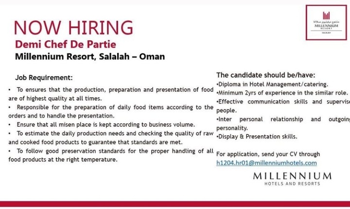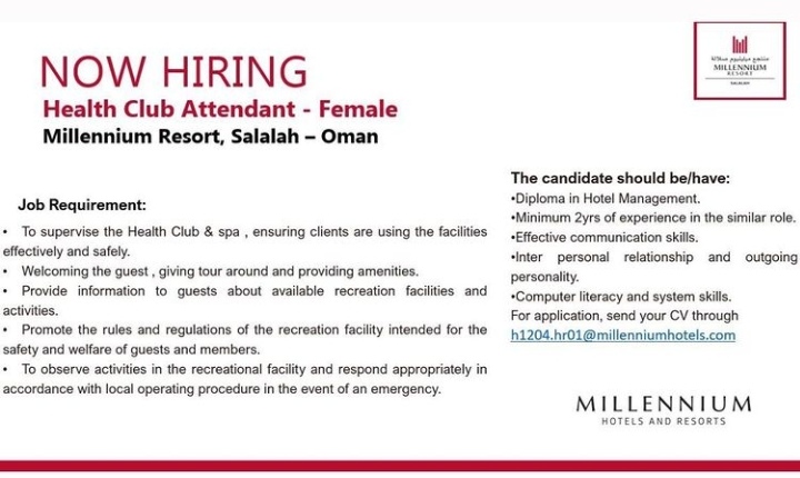 أعلن منتجع ميلينيوم صلالة عن رغبته بتعيين لديه :