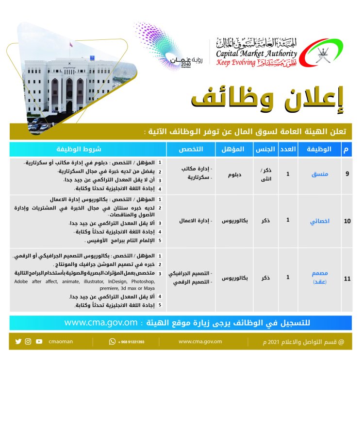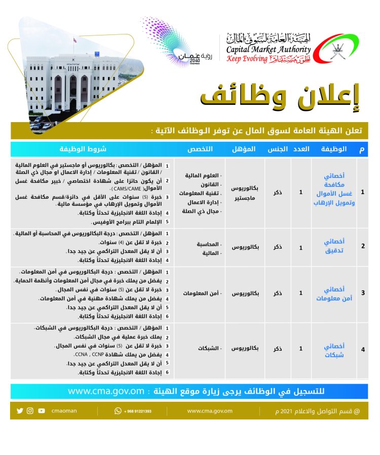 أعلنت الهيئة العامة لسوق المال عن توفر وظائف شاغرة في الهيئة، و للاطلاع على التفاصيل اضغط هنا
