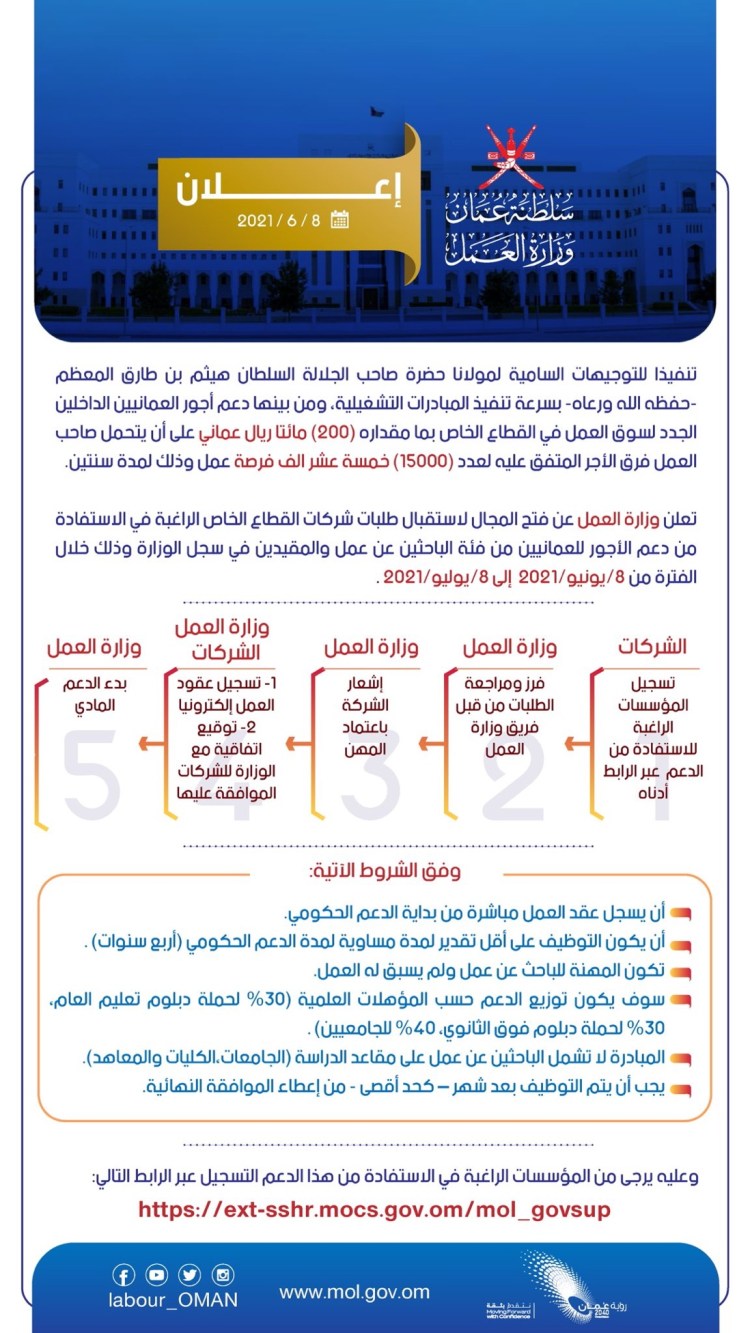 أعلنت وزارة العمل عن فتح المجال لإستقبال طلبات القطاع الخاص الراغبة في الاستفادة من دعم الأجور للعمانيين من فئة الباحثين عن عمل والمقيدين في سجل الوزارة وذلك خلال الفترة من ٢٠٢١/٦/٨ إلى ٢٠٢١/٧/٨م.