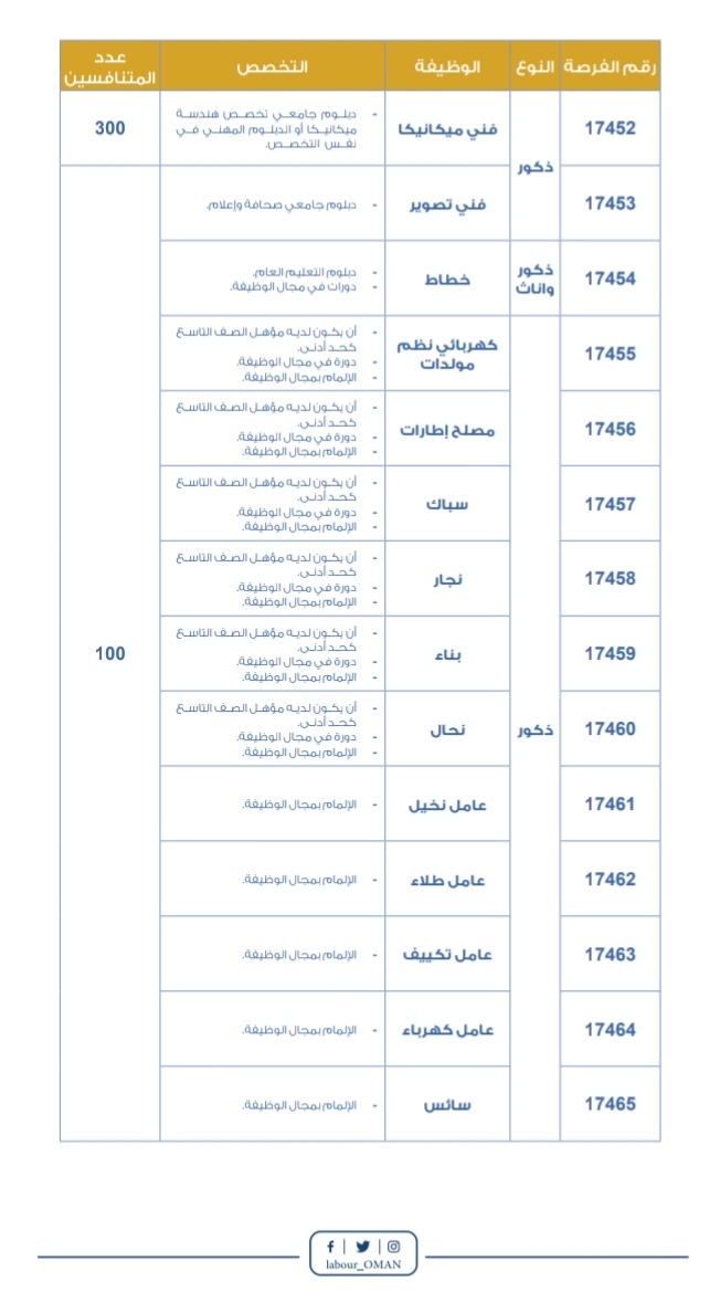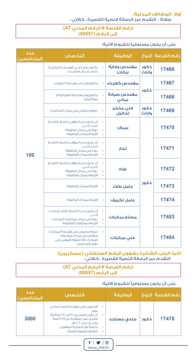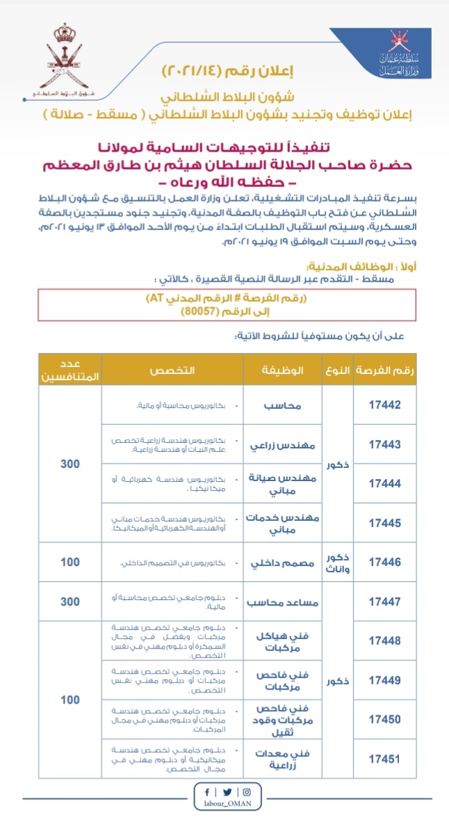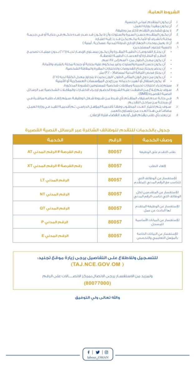 أعلنت وزارة العمل بالتنسيق مع شؤون البلاط السلطاني عن فتح باب التوظيف بالصفة المدنية ،وتجنيد جنود مستجدين بالصفة العسكرية ابتداء من 13يونيو 2021م وحتى يوم السبت الموافق 19 يونيو 2021 م.