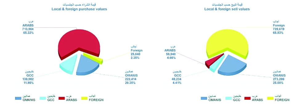 واستحوذ العرب على صفقات البيع بقيمة بلغت 713.9 ألف ريال عماني وبنسبة 65.3 من إجمالي قيمة الشراء، في حين اشترى العمانيون بقيمة 222.4 ألف ريال عماني، أما حركة البيع فقد استحوذ عليها المستثمرون الأجانب بقيمة بلغت 720.6 ألف ريال عماني أي ما نسبته 65.9 بالمائة من إجمالي قيمة البيع، في حين باع العمانيون بقيمة 273.2 ألف ريال عماني.
