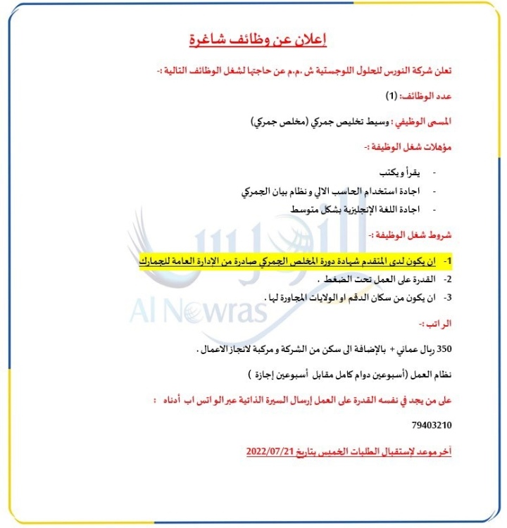 أعلنت شركة النورس للحلول اللوجستية عن رغبتها بتعيين لديها وسيط تخليص جمركي .