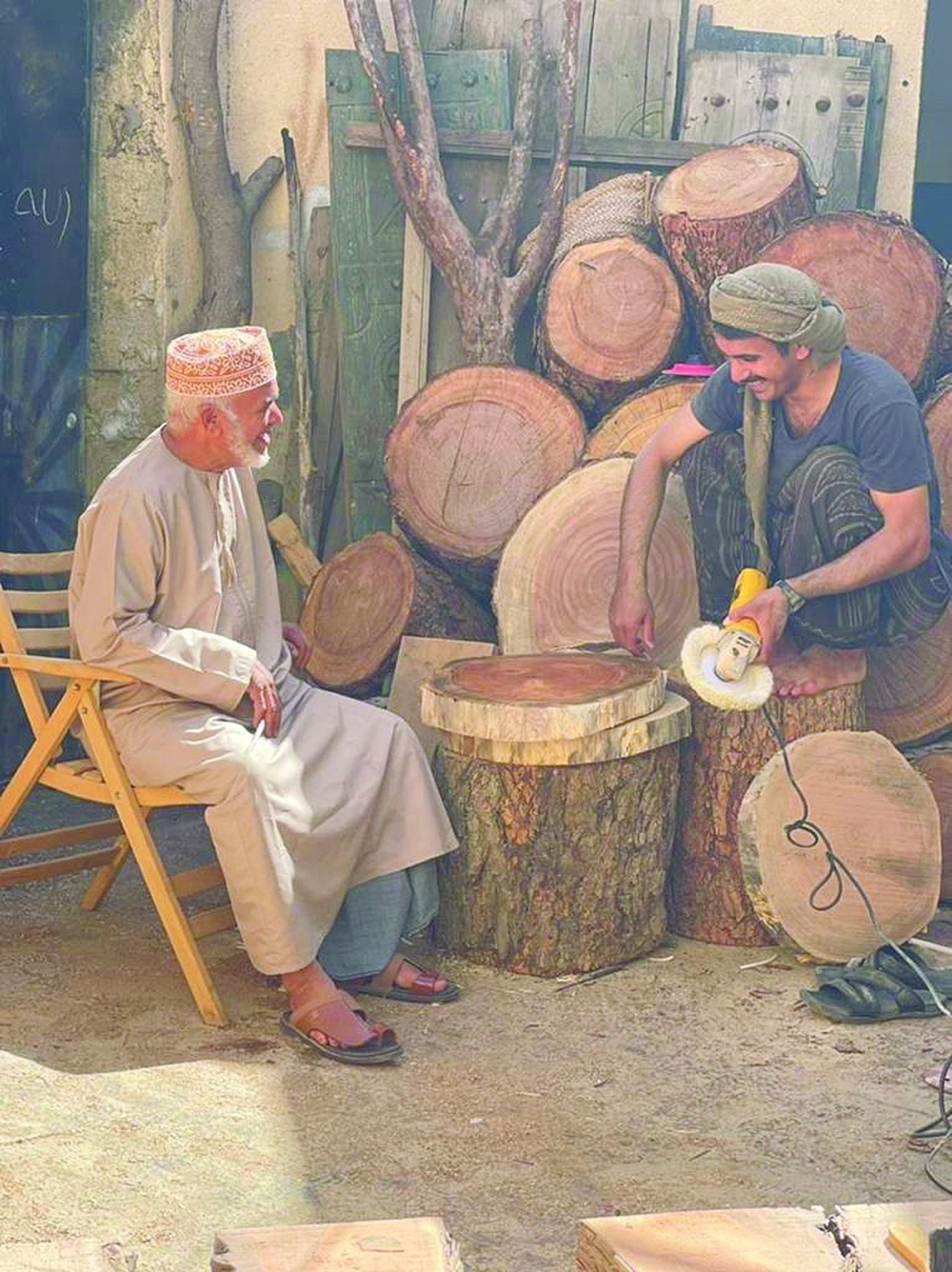وكان أول عمل صنعته بيدي هو قبضة المنجل، وهي أيضًا من الأدوات المستخدمة في الزراعة وبالتحديد في ترتيب النخيل والمتعارف عليه لدى العمانيين بـ(المخلب)، حيث صنعت هذه القبضة من خشب الشجرة وبدأت بنحته بنفسي إلى أن اكتمل العمل.. حينها رأيت ذلك إنجازًا عظيمًا؛ لأنني صنعته من الصفر، وفي وقت بسيط، أيضًا من الأعمال التي قمت بصناعتها وتعلمت نحتها هي مكتبة صغيرة أضع فيها الكتب، حيث صنعت هذه المكتبة من خامات الخشب الطبيعي والمحلي.