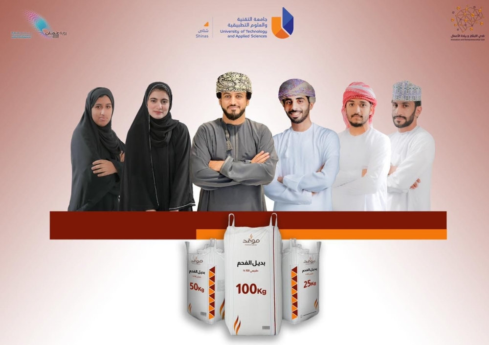 مسقط /العُمانية/ تسعى عقول شابة نابضة بالإنجاز إلى إيجاد الحلول لتوفير بيئة مناسبة وآمنة، حيث قام فريق طلابي من جامعة التقنية والعلوم التطبيقية بشناص بابتكار منتج (صخمة) وهو منتج طبيعي 100 بالمائة ويعتمد على استغلال الخامات المحلية المهدرة مما يوجِدُ قيمة مضافة، ويُعدُّ بديلًا للفحم ويتميز بسرعة اشتعاله وعدم انبعاث الغازات الضارة منه.
