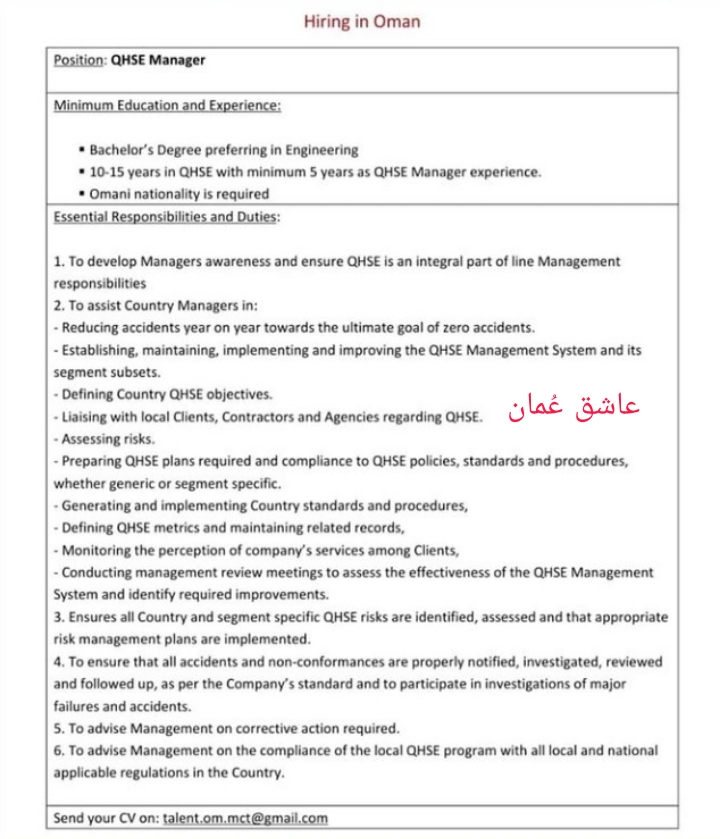 أعلنت شركة رائدة عن رغبتها بتعيين لديها مدير QHSE