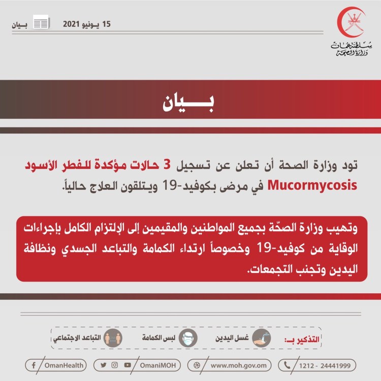 أعلنت وزارة الصحة تسجل ٣ حالات مؤكدة للفطر الأسود Mucormycosis في مرضى بكوفيد-١٩.